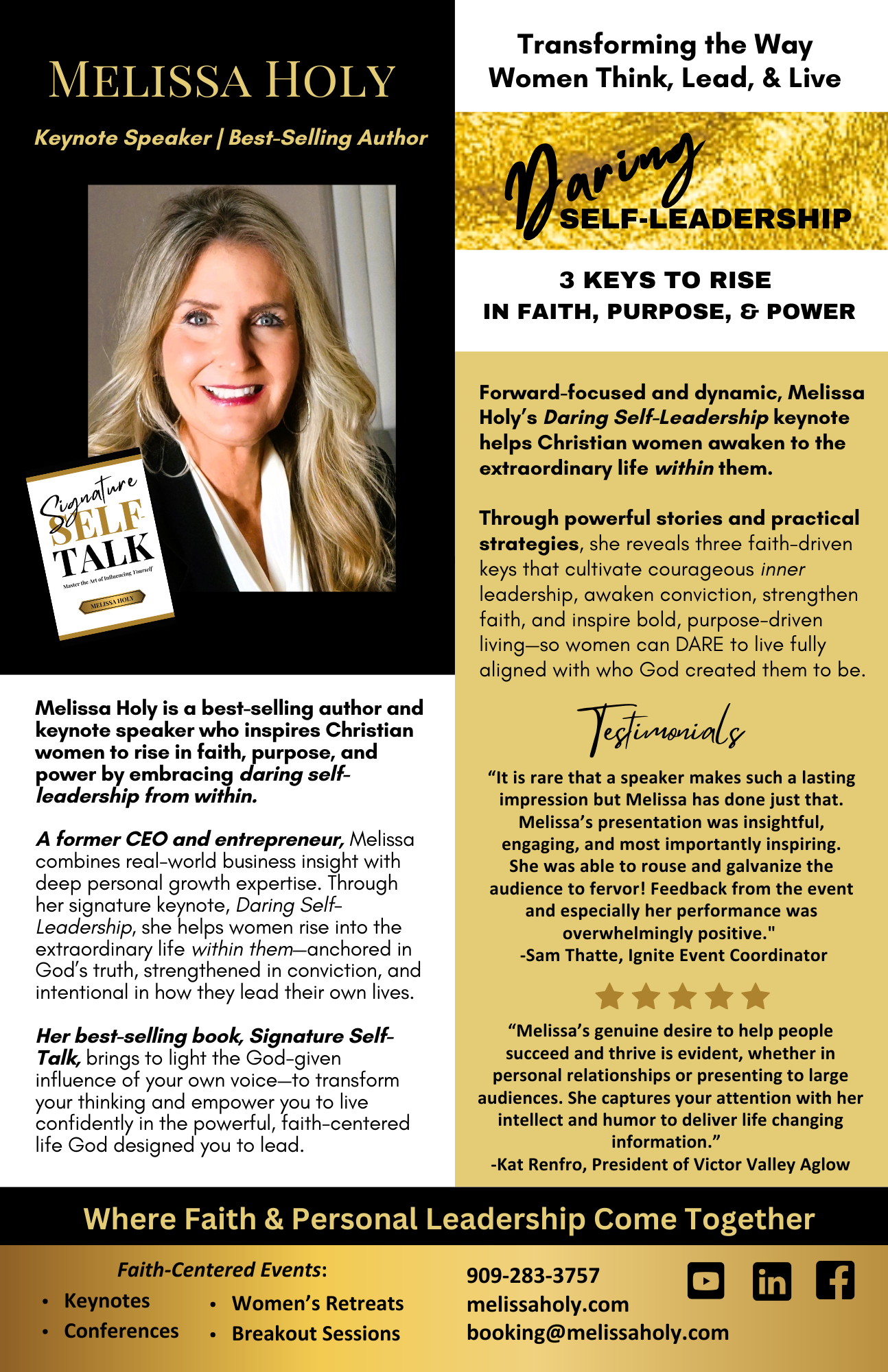 Forward-focused and dynamic, Melissa Holy’s DARING SELF-LEADERSHIP keynote reveals three faith-driven keys to help women rise in faith, purpose, and power— and hold fast to living their beliefs in a world of compromise and distraction.